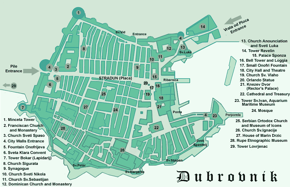 La disposición interna de la villa histórica la define una ancha avenida longitudinal denominada Placa o Stradun, que es la calle más ancha y célebre de Dubrovnik y divide la ciudad en una zona meridional y otra septentrional.