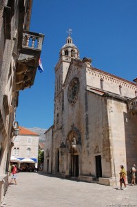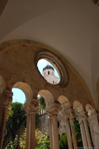 Nuestra primera visita fue El Monasterio Franciscano, que se empezó a construir en el año 1317, pero en el terremoto de 1667 su iglesia quedó totalmente destruida, construyéndose después del terremoto la actual iglesia barroca. Del templo original sólo se conserva la portada meridional. Sabemos por un contrato de 1498 que esta portada se hizo en el taller de los hermanos Leonard y Petar Petrovic. En el tímpano aparece la piedad y sobre las jambas se encuentran las figuras de San Jerónimo y San Juan Bautista. Finalmente, corona el conjunto sobre el tímpano la figura de Dios Padre. El claustro, realizado en 1360, en románico tardío es uno de los más bellos claustros raguseos, aunque disponen de otro claustro gótico que no puede contemplar el público porque es de uso exclusivo de los monjes.(03)