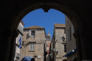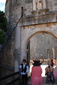 Iniciamos nuestro recorrido en esta villa entrando por La Puerta de Pile, que fue durante siglos el principal acceso de la ciudad. Su aspecto actual data de 1537 cuando se erigió la torre semicilíndrica de la puerta exterior con un arco renacentista, en cuya parte superior hay una hornacina con la estatua de San Blas, patrón de Dubrovnik. A la puerta se accede por un puente de piedra, tendido sobre un profundo foso defensivo. Frente a la entrada hay un puente levadizo de madera que cada noche se alzaba mediante cadenas. En 1460 se construyó la puerta interior en estilo gótico.(01)
