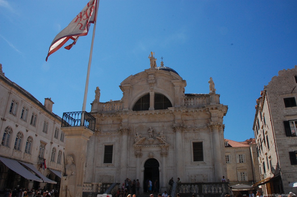 El edificio más destacado de la plaza es La Iglesia de San Blas, el santo patrón de Dubrovnik, que fue construida en estilo barroco en el año 1715, en el lugar que antes ocupaba la antigua iglesia románica dedicada al mismo santo y destruida por el terremoto de 1667 y por un incendio. El templo actual fue edificado por el arquitecto veneciano Marino Gropelli, tomando como modelo la iglesia veneciana de San Mauricio. La rica ornamentación de la portada, contrasta con las fachadas sencillas y austeras de los edificios de Placa. En el interior hay bellos altares de mármoles de colores.(07)