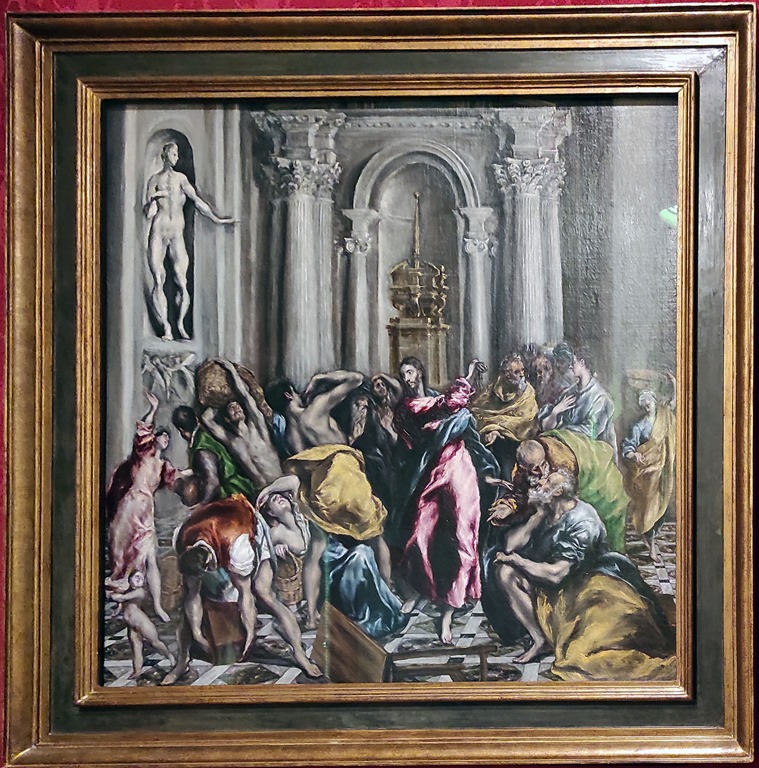 Continuando con la visita, nuestra guía oficial Luisa Velasco nos enseñó una iglesia muy tradicional de Madrid y un impresionante belén con unos ropajes, bordados, decoración, etc, que sin duda nos dejaron sorprendidos. También tuvimos la suerte de poder contemplar el cuadro de El Greco: “la expulsión de los mercaderes del templo” ó “la purificación del templo” que en está ocasión se mostraba al público. En el archivo de la Real iglesia de San Ginés hay un documento del rey Carlos III, quien trae de Nápoles la tradición de los belenes y, como rey de España, quiere rendir culto al rey de reyes mandando hacer un belén de tamaño casi natural para la Real iglesia de San Ginés de Madrid. De esta Epifanía sólo queda la escultura original de la Virgen María. San José y los Magos datan de finales del siglo XX. Los ropajes y disposición de las figuras cambian todos los años, dotando a este hermoso belén de gran realismo y vivacidad. Los trajes representan a todos los territorios que formaban el reino de España en el siglo XVIII: El ropaje de Baltasar procede del reino de Perú y la capa tiene su origen en las sederías valencianas. La vestimenta de Gaspar se realizó con telas de la Real Fábrica de Tapices de Madrid. El traje de Melchor procede de Filipinas y la capa es de sederías de Toledo El ropaje de San José viene de Méjico. Desde allí llegaban a España las sedas del Galeón de Manila. La Virgen María lleva un traje con hilatura de plata, que se cree que pertenecía a la reina o a alguna de las infantas de España. El Niño Jesús es un “Niño Rey del Universo” con el orbe de plata en la mano. Este año, la Virgen aparece tumbada y sin el Niño Jesús, ya que éste será colocado en la noche de su nacimiento, el 24 de diciembre en el belén.