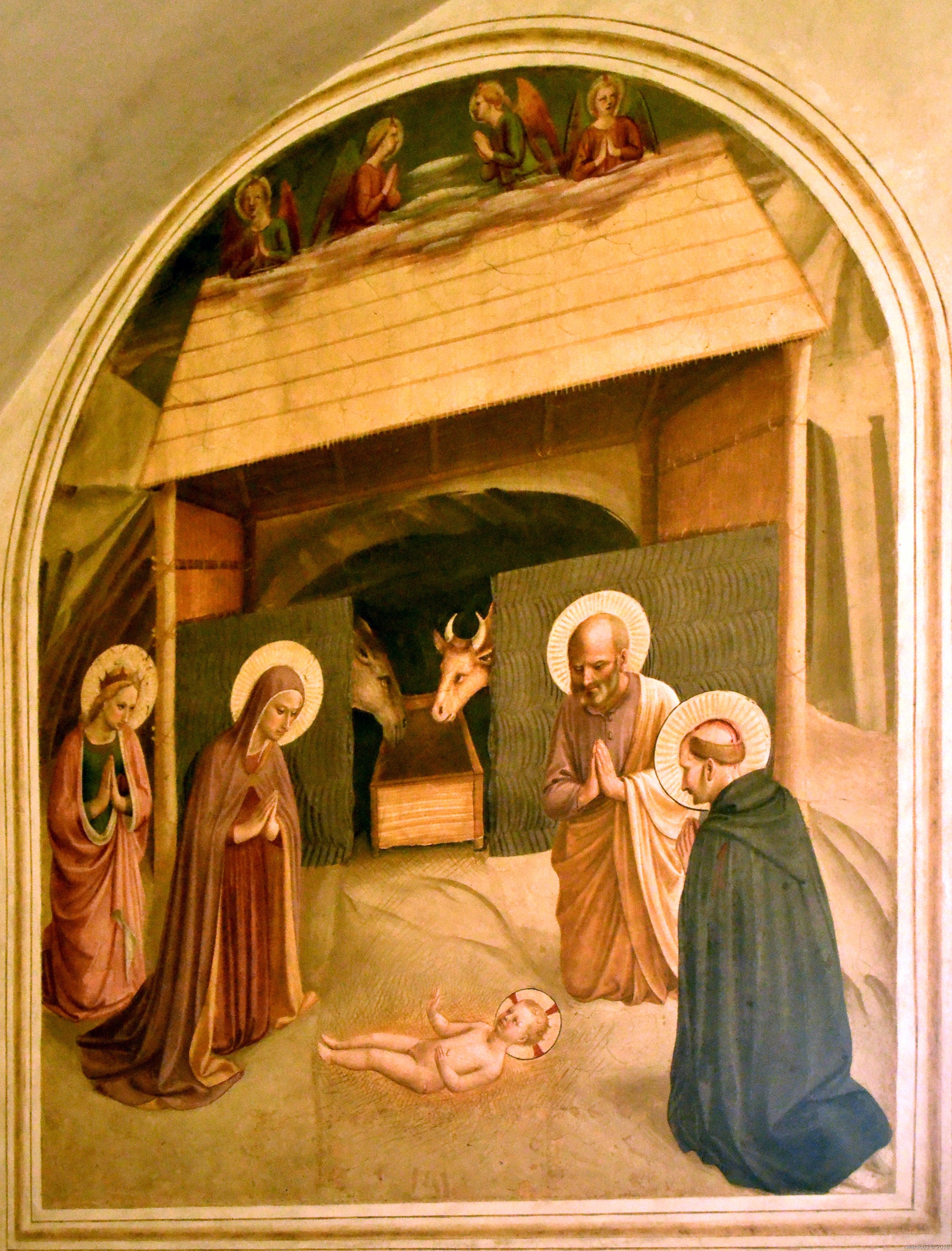Fra Angélico, en esta Natividad del convento de San Marcos, pinta al Niño Jesús en el centro compositivo con el nimbo crucífero, como símbolo del martirio de su muerte, entre la Virgen y San José. También aparecen adorando a Jesús Santo Domingo de Guzmán, y Santa Margarita de Hungría, una de las primeras religiosas de la Orden. Ambos santos nacieron en el siglo XIII.