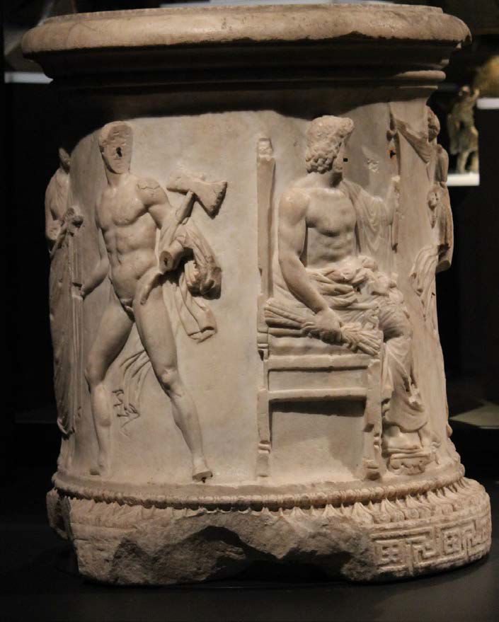 Según Hesíodo, Atenea es la única hija de Zeus y Metis. Urano y Gea revelaron a Zeus que Metis tendría una hija y que a continuación tendría un hijo destinado a derrocar el Imperio de Zeus, como él había hecho con su padre, Urano. Zeus para evitar este destino se tragó a Metis cuando estaba embarazada. En el momento previsto para el parto Zeus sintió un terrible dolor de cabeza y convenció a su hijo Hefesto para que le diera un hachazo en el cráneo. De la cabeza de Zeus nació Atenea como una mujer adulta, vestida y armada con un escudo, una lanza y un casco. PUTEAL DE LA MONCLOA. MUSEO ARQUEOLÓGICO, MADRID Atenea nace completamente armada: · Lleva un casco con grifos, animales fabulosos con la parte superior del cuerpo de águila y la inferior de león, símbolo de su poder. · La égida o coraza de piel de cabra protegiendo su pecho. · La lanza y el escudo. Es una de las diosas más importantes del panteón griego. El nacimiento de Atenea de la cabeza de Zeus se ha interpretado como un intento de adjudicar la sabiduría a lo patriarcal, considerándola una prerrogativa masculina. Este acontecimiento se narra en el frontón oriental del Partenón y en Madrid podemos verlo en el relieve del pozo de la Moncloa, en el Museo Arqueológico.